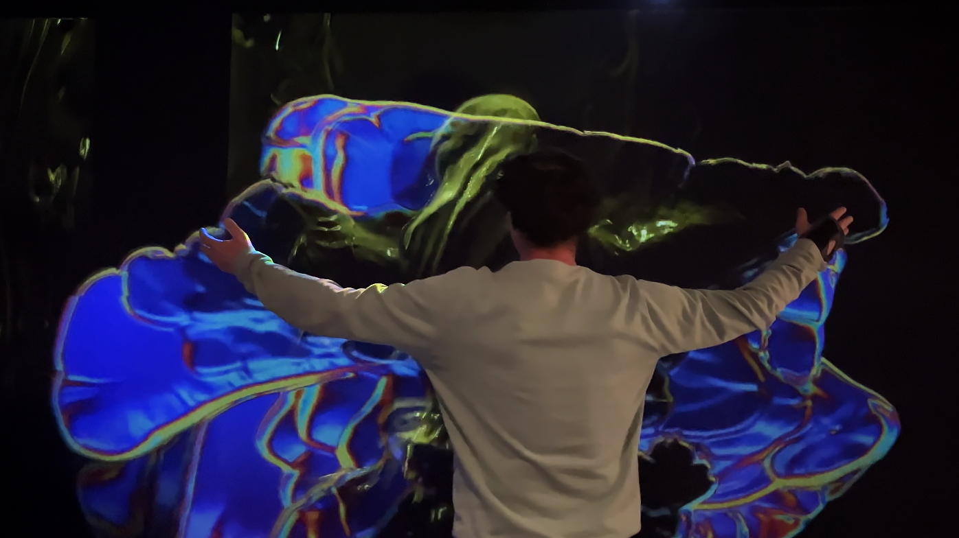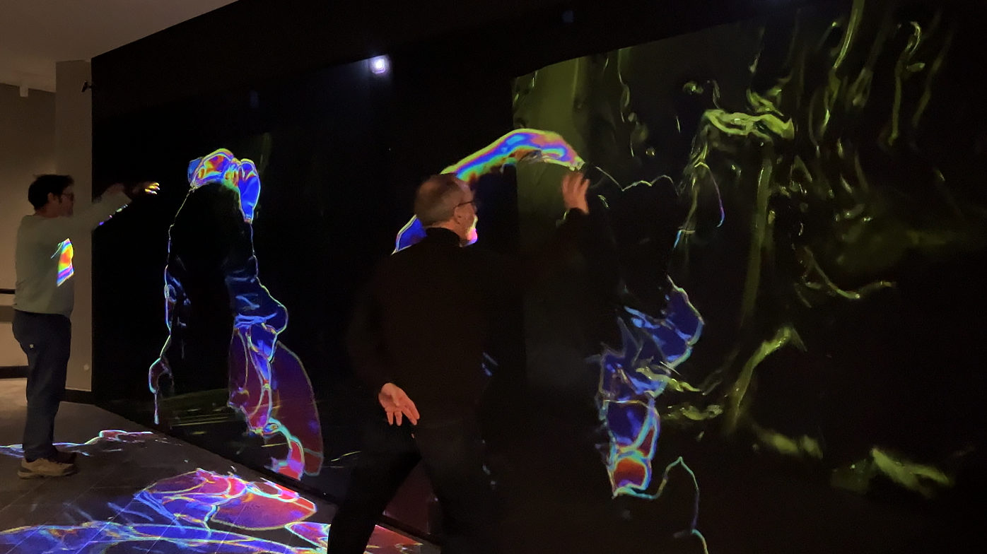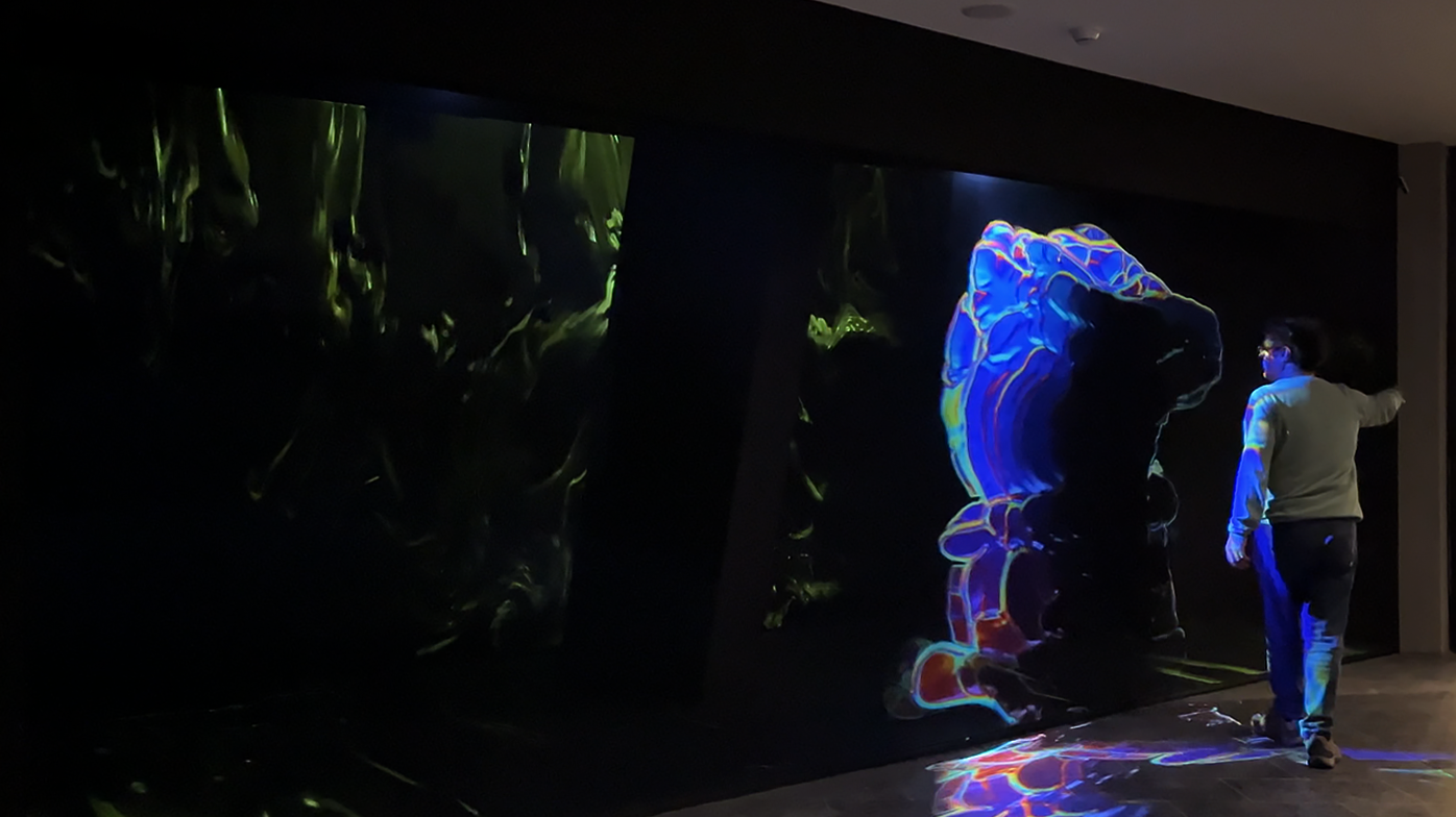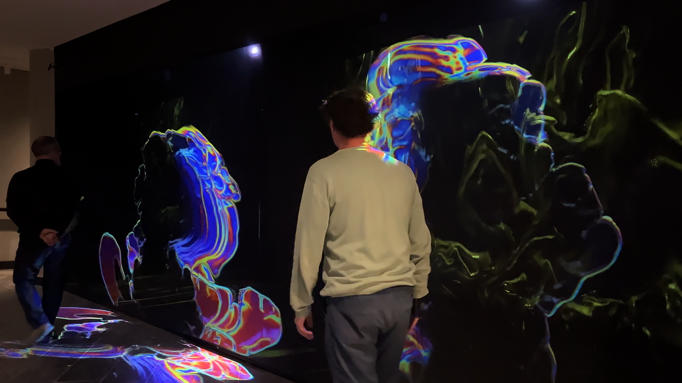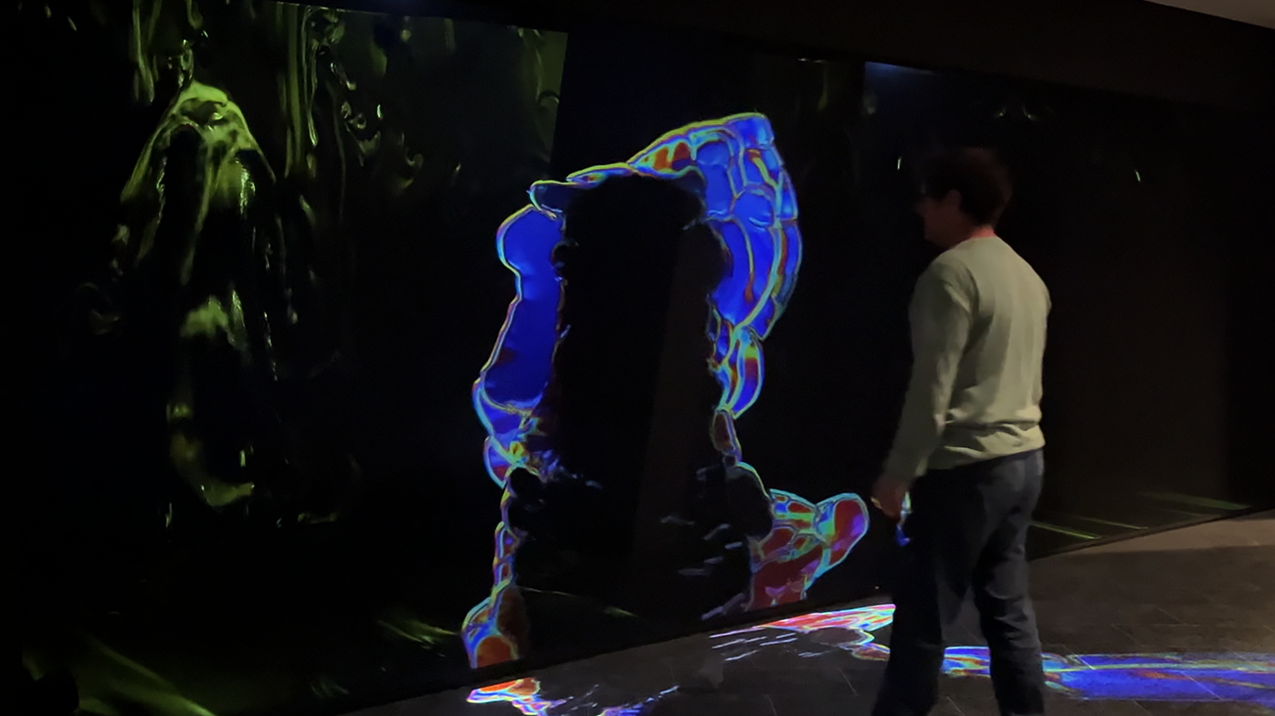 La superposition des deux plans de projection crée un effet de profondeur saisissant : le visiteur perçoit naturellement le glissement des plans l'un par rapport à l'autre à mesure qu'il se déplace, renforçant l'illusion d'une immersion physique dans la substance. Une bande-son générative et immersive accompagne le flux, renforçant la sensation de présence physique de la matière.