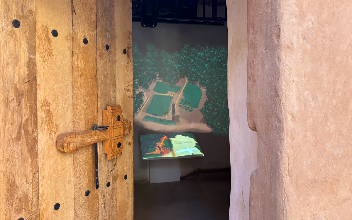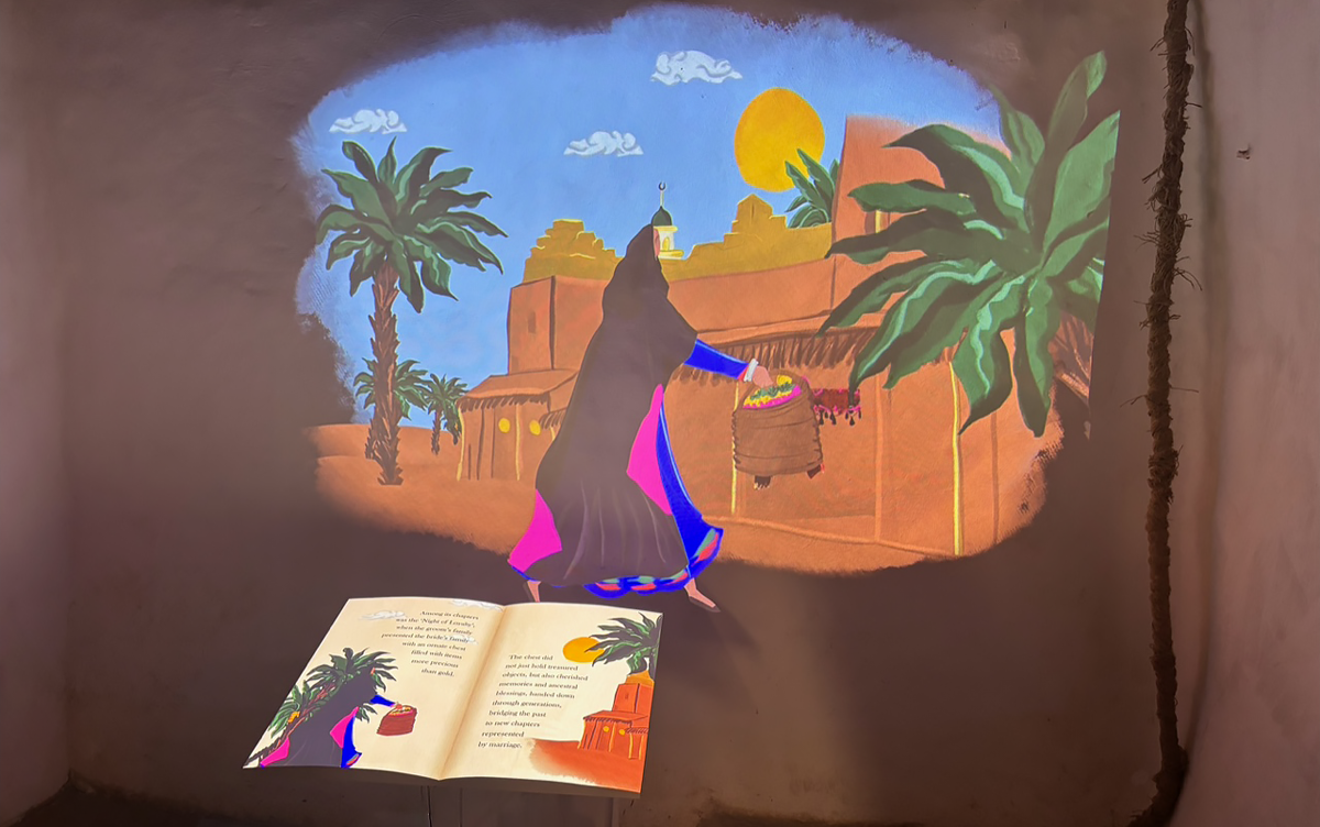 Au sein de la vieille ville, nous avons conçu un dispositif narratif immersif prenant la forme d’un livre ouvert. L’histoire est projetée sur un mobilier sculptural, transformant l’objet en surface vivante et interactive. Le visiteur explore le récit par le geste : en caressant le décor comme on feuillette des pages, il révèle progressivement les scènes et leurs illustrations réalisées par l'artiste saoudienne Ethar Balkhair.