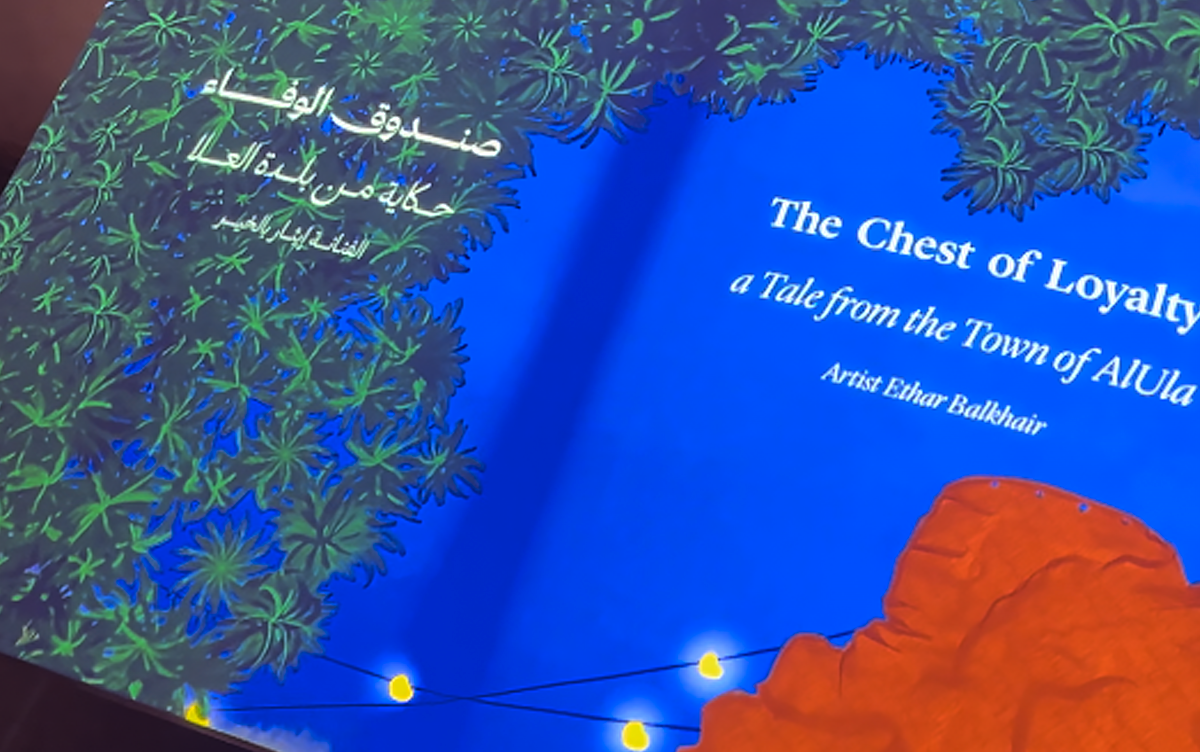 La première double page introduit le conte dans ses deux langues : à droite, le titre en anglais “ The Chest of Loyalty – A Tale from the Town of Alula ” (Le Coffre de la Loyauté - Un conte de la ville d'AlUla) ; à gauche, son équivalent en arabe. Selon la page que le visiteur choisit d’ouvrir, il découvre l’histoire dans la langue correspondante, accompagnée de la voix de la narratrice.