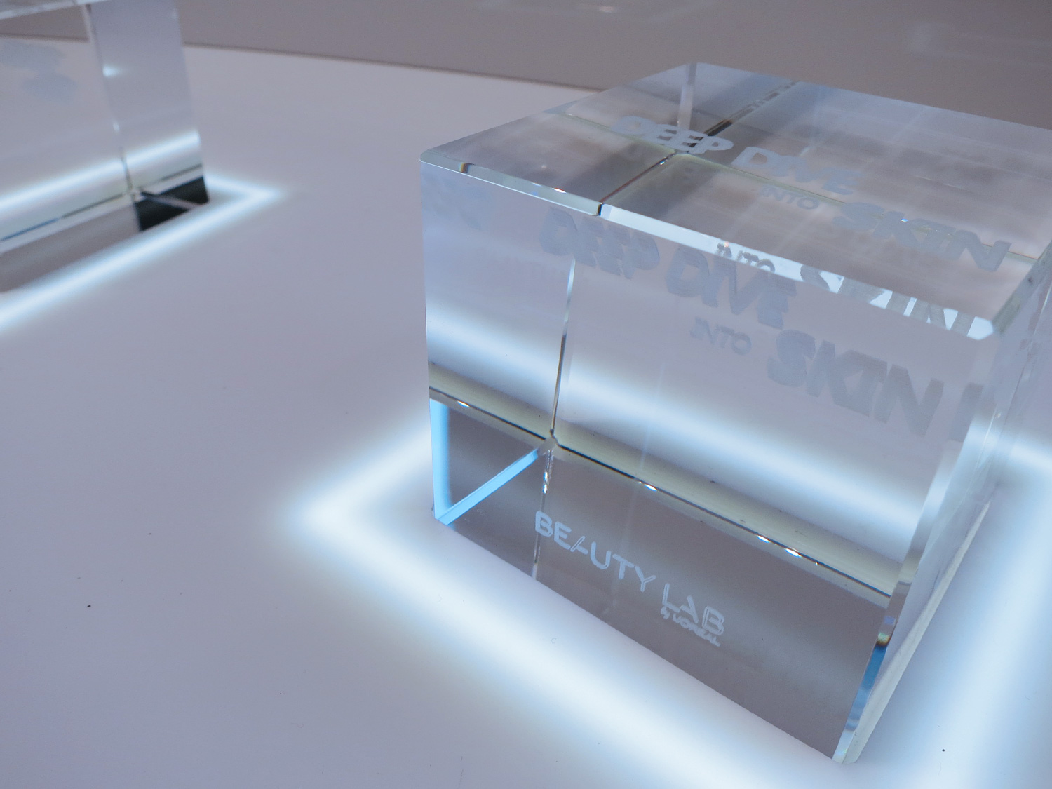 Le deuxième présentoir présente sur le plateau en corian des cubes transparents gravés chacun d'une thématique et placés dans des encoches dédiés. Le visiteur choisit le cube / le sujet qui l'intéresse et vient le placer sur le support central afin de lancer la vidéo dédiée.